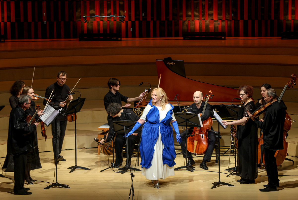 Хотя за свою карьеру Кермес пела много разной музыки, сегодня она предпочитает показываться в барочном репертуаре – том, который сделал ей имя, и который, видимо, она чувствует лучше и считает стопроцентно своим. Концерт в «Зарядье», где певица по традиции выступила с камерным аутентичным оркестром «Пратум интегрум» (они сотрудничали уже не раз), подарил московской публике встречу с ариями из опер и ораторий Пёрселла, Винчи, Порпоры, Монтеверди, Вивальди и Генделя. В отличие от концерта двухлетней давности в том же зале, также предновогоднего, ныне совсем не было ходок на территорию современной эстрады (тогда певица пела композиции Стинга и Леди Гаги), и в целом меньше театрализации и задорного экшна, чем вообще-то славится певица – хотя она и вышла на сцену в темноте и закутанной в белый балахон, с элементами неожиданной эпатажности было в разы скромнее. К таковым можно лишь отнести чудаковатые элементы костюма, сочетающие барочную приторность и современные материалы, которые певица периодически надевала поверх белого концертного платья, меняя чехлы-сарафаны, длинные перчатки и накидки в зависимости от характера исполняемого сочинения. Да всегда присущую этой артистке манеру пританцовывать в такт энергичной музыке барокко в фуриозных ариях – за что ее исполнительский стиль давно пресса окрестила как «рок-барокко». Даже общения в микрофон по-русски, что любит делать немного владеющая нашим языком уроженка ГДР, придавая классическому концерту формат ток-шоу, было очень дозированно.