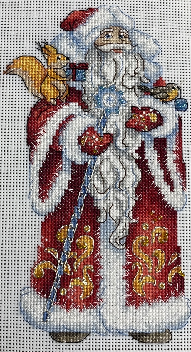 Не прошло и полугода!))) Или прошло?🫣 Вышивка этого дизайна начиналась как «Дед Мороз и лето» - меня не смущает, какой месяц на дворе в процессе подготовки к новому году. Я все равно не успею к новому году вышить все, что хотела)). Хотелки у меня непомерные в этом плане😜. Передняя часть дизайна вышилась шустро А вот вторая его половинка (нет, не Снегурочка, а то место, которым избушка к лесу поворачивалась) как-то подзатянулась🤦♀️. Дед Мороз попутешествовал знатно. Вышивался и в городе, и на даче, и в машине, и в поезде, и в Москва-Сити и еще в нескольких неожиданных местах). Путешественник Дед получился. Но он не жаловался - когда бы еще мир повидал). Вот так он выглядел в последний отчет Примерно в этот период я поняла, что Новый год то он уже здрастеприехали, а Дед в неподобающем виде до сих пор). Засовестилась и вот Все крестики и бисер готовы 🤗 И бэкстич подоспел Встретились наконец две половинки🤣 Фигурка большая, около 20 см. В комплектацию набора уже входит ажурная акрил