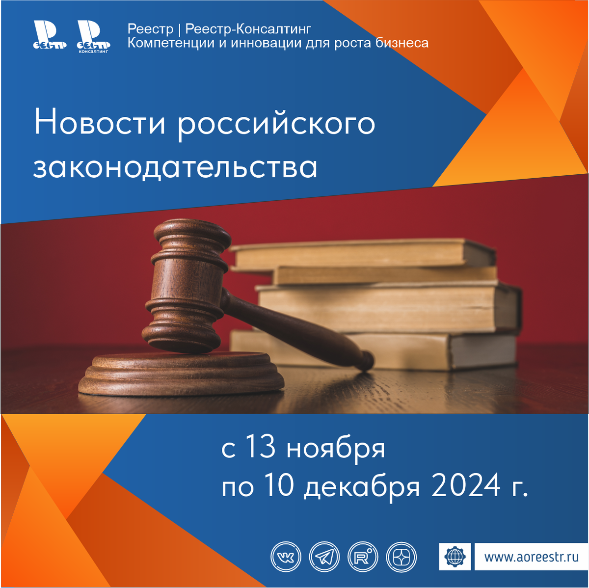 Специалистами АО «Реестр» подготовлен обзор новостей российского законодательства за период c 13 ноября по 10 декабря 2024 г.Скачать подробный дайджест.