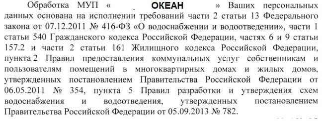 Пишу жалобу в РКН с просьбой выяснить - откуда у коммунальщиков мои паспортные данные. В течение месяца получаю ответ: лицевой счёт на мои квартиру и участок открыт в 2020 г. неким МУП "Русалка", которое на тот момент содержало коммунальные сети нашего поселка. В 2021 г. это МУП "Русалка" подвергается реорганизации путём присоединения к МУП "Океан" и передаёт ему все имеющиеся у них мои паспортные данные. Что касаемо законности обработки паспортных данных РКН написал следующее: