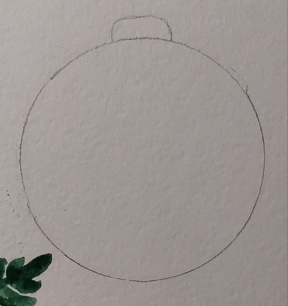 Нарисуем небольшую новогоднюю открытку с композицией из ёлочных игрушек. Вторая (правая верхняя) часть композиции будет состоять из классического ёлочного шара. 1. Для наброска обозначим границы шара в виде круга и крепление. 2. Сделаем три горизонтальные линии, которые будут определять рисунок шара. Эти линии в последствие будут веточками. 3. К веткам добавим листочков разных размеров: центральная ветка будет иметь наиболее крупные листочки, ветки, расположенные сверху и снизу, будут с более мелкими листочками. 4. На центральную веточку также добавим ответвления с ягодками. Количество ягод зависит от количества свободного места. 5. Верхняя часть шара будет наиболее темной, поэтому возьмём насыщенный темный зеленый и раскрасим им листочки и веточку. 6. Смешав темный зеленый и немного синего, нарисуем листики и все ответвления центральной веточки. 7. Бордовым или несильно броским розовым нарисуем ягодки. 8. Синим цветом с небольшим добавлением зеленого нарисуем листочки самой нижней вет