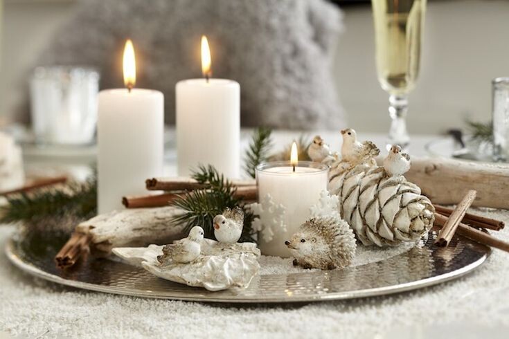 Их раскладывают в центре стола вокруг тарелки с основным блюдом, вазами с фруктами или закусками. Ещё вариант — развесить еловые венки на спинки стульев, только убедитесь, что они не создают дискомфорта на этих стульях сидящим.