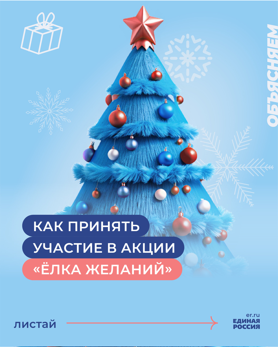 Каждый год в России проходит благотворительная акция «Ёлка желаний». Депутаты и активисты Единой России участвуют в этой акции и помогают исполнять желания маленьких жителей страны.