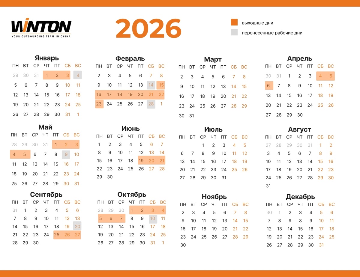 🔸 Чуньцзе (Китайский Новый год) – 17 февраля. Официальные выходные – с 15 по 23 февраля (9 дней). Рабочие дни: 14 февраля (сб) и 28 февраля (сб).