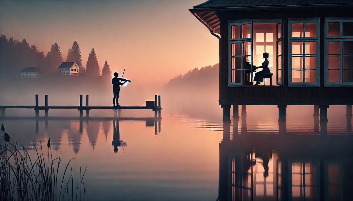 Наутро, едва встав, Лариса услышала, как сквозь тонкую ткань занавесок проникла мелодия скрипки. Звук был чистым и тонким, словно серебряная нить, протянутая над водой. Он доносился откуда-то со стороны причала. Она прислушалась: звук молодой, ещё робкий, будто играющий ищет баланс между слухом и душой. Лариса подошла к окну: на дальнем деревянном настиле, ведущем в озеро, стоял юноша. Ему можно было дать лет двадцать. Он, погружённый в свою музыку, будто не замечал мира вокруг. Лариса улыбнулась, почувствовав странный прилив тепла.