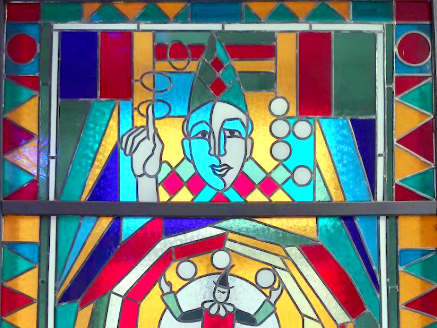Музей Дурова. Там таких мозаек четыре штуки, но три из них закрыты шкафами (прямо как в музее Горького в Москве, погуглите, какие там витражи спрятал великий писатель за шкафы). У нас в музее витражи 1980-х годов, на цирковую тематику: