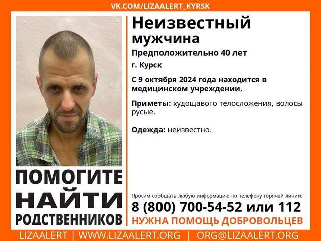 Внимание! Поисковый отряд «Лиза Алерт Курская область» просит помочь в поиске родных неизвестного, который находится в одной из больниц Курска. По данным волонтеров, распространивших фото мужчины, предположительно ему 40 лет. Судя по всему, страдает потерей памяти. С 9 октября находится в медицинском учреждении. Приметы: худощавого телосложения, волосы русые. В тему: Сергей Яшин, по материалам ВК «Лиза Алерт Курск» Постоянный адрес новости на сайте «Друг для друга» ~ https://dddkursk.ru/lenta/2024/12/17/114554/. Новости Курска за ~ 17 декабря ~ декабрь 2024 года.