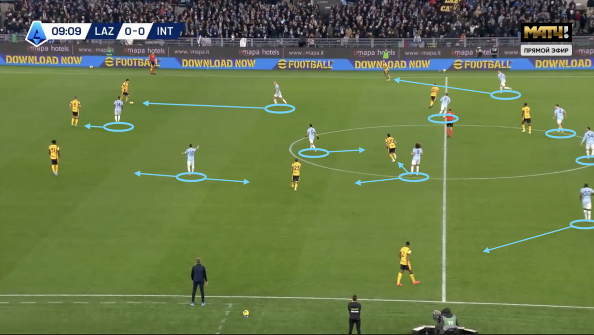 Для преодоления оборонительного блока соперника «Интер» намеренно, а, возможно, и вынуждено передачами назад вытягивал на себя игроков «Лацио», чтобы растянуть их структуру по вертикали, создавая открытые зоны для продвижения мяча через них.