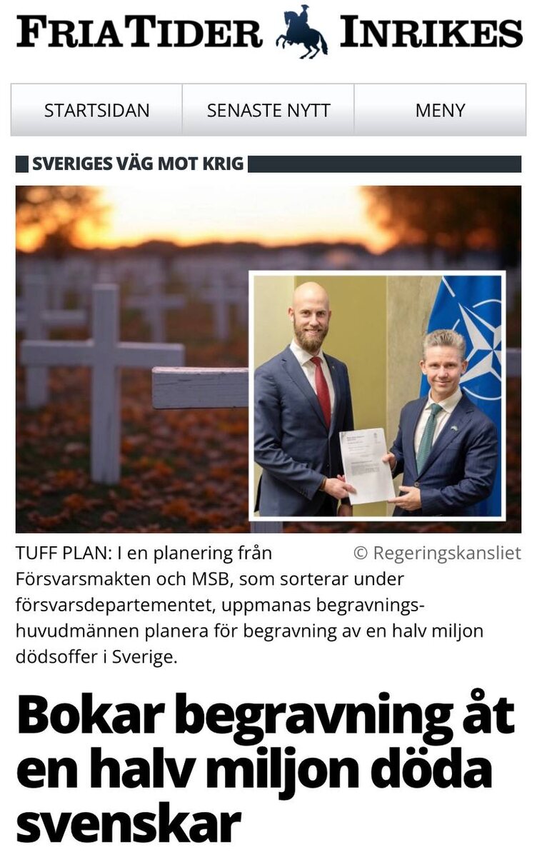 Правительство недавно вступившей в НАТО страны рассчитывает, что при потенциальном вооруженном конфликте с Россией потери со стороны Швеции составят около 5% от всего населения. Также планируется, что правительство в случае возможного провала покинет страну и будет продолжать вести военные действия против РФ от лица США.