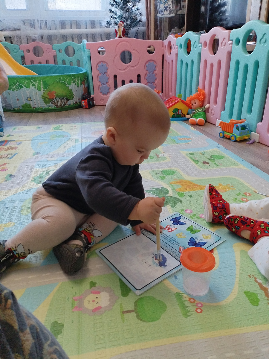 Амелия научилась открывать и закрывать фломастеры. Теперь ее не оторвешь от этого дела. Я фломастеры все убрала, а то Амелия умудрилась оттуда выдрать стержень. Даю ей водные маркеры. Пусть открывает, закрывает, полезно.