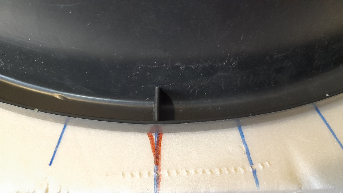 Разметку по донышку я уже показала как делать (см.здесь), теперь переворачиваем ведро вверх дном и устанавливаем на шаблоне так, чтобы ребра жесткости (ориентируемся на те, что не под ручкой) четко совпали с диаметром на шаблоне.