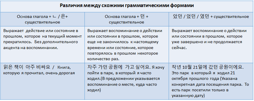 Глагол + 았던 / 였던 / 었던+ сущ., глагол + 은 /ㄴ+ сущ., глагол + 던 + сущ. Разница в использовании.