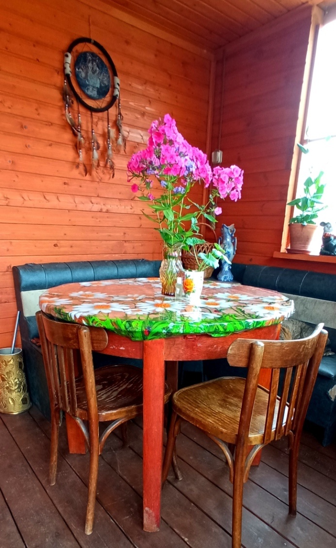 На веранде стол смотрится как на своём месте. Вот только проблема его покрытия долго не решалась. Скатерти стол только портили.