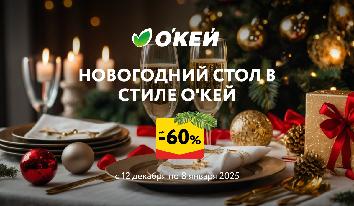 Торжественно заявляем, что мы основательно подготовились к новогодним праздникам, которые ждут всех жителей страны с 29 декабря по 8 января 2025 года! В вашем распоряжении будет целых одиннадцать дней праздничного отдыха. За это время можно успеть сделать то, что будет согревать вас воспоминаниями целый год. Запланируйте праздничные обеды и ужины, уютные рождественские посиделки, прогулки на свежем воздухе, поездки на природу, спортивные мероприятия или спокойное домашнее времяпрепровождение. А мы поможем вам это устроить наилучшим образом! И для начала объявляем период приятных скидок с 12 декабря 2024 по 8 января 2025 года. Если у вас есть О'КАРТА, вы сможете сэкономить от 20 до 50% стоимости. Сервировка праздничного стола Чтобы наступающий год стал особенным, начните обновления с праздничного стола, застелите его красивой скатертью. Обратите внимание на жемчужно-мерцающую скатерть «Венеция Звезды» светло-серого цвета. Она рассчитана на достаточно большой стол (180 х 150 см), не впи