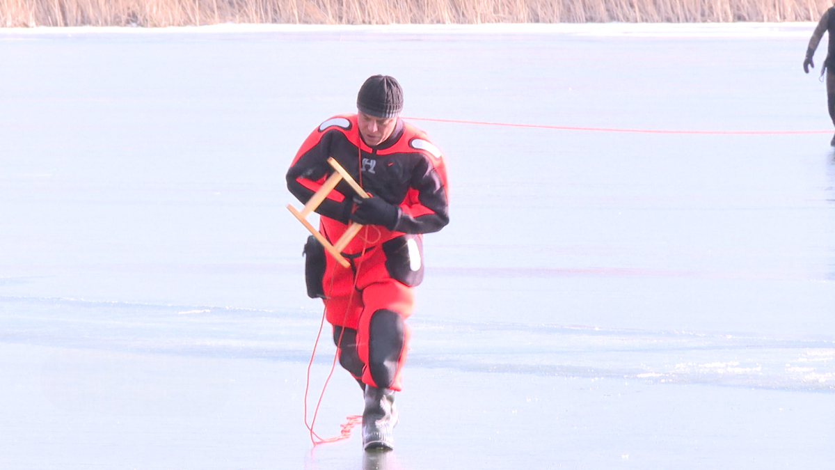 Это не кадры учений – работа специалистов. На замерзшую гладь озера выходят сотрудники аварийно-спасательной службы. Уже второй день они ведут здесь поисковые работы. Условия крайне опасные – лед трескается под ногами.