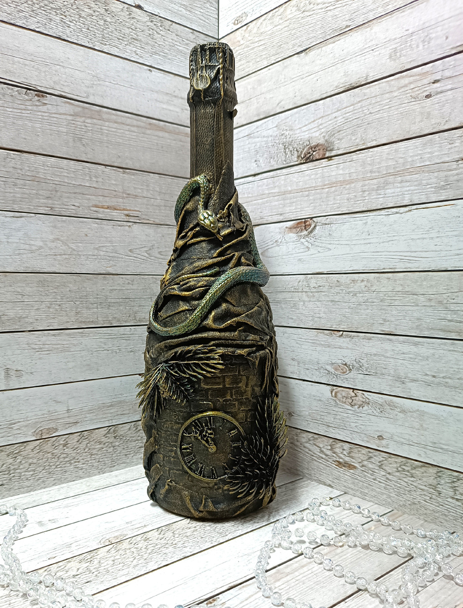 Бутылка готова! Но мне подумалось, что змейку надо как-то подчеркнуть еще больше! Она ведь зеленой должна быть в соответствии с Китайским гороскопом. Поэтому я слегка прошлась по змее и елочкам прозрачной зеленой перламутровой краской: