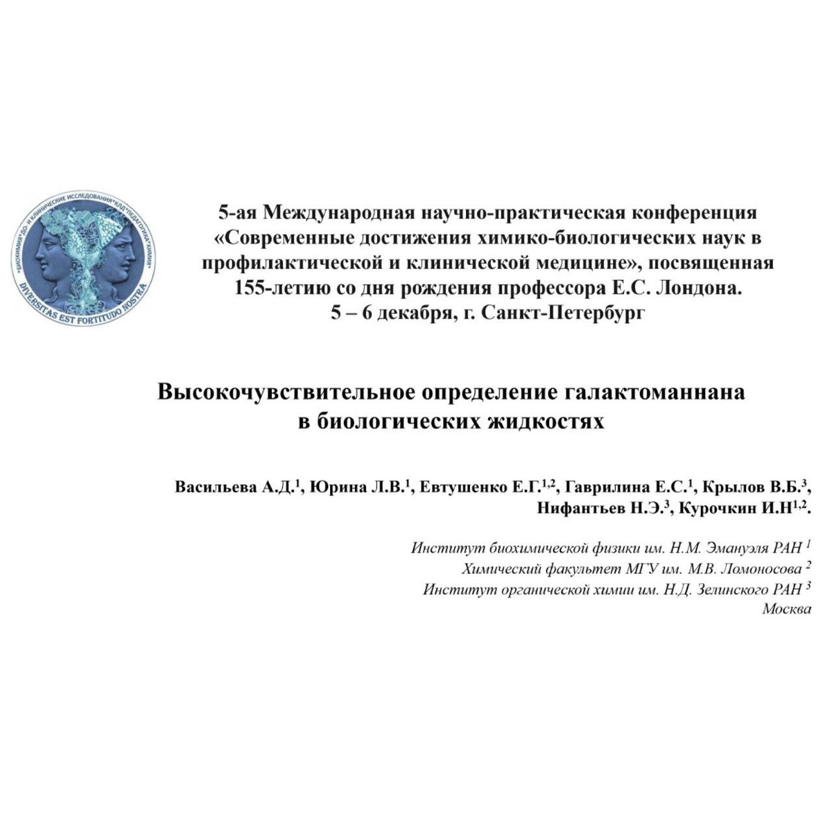 В секции «Инновационные технологии в клинической лабораторной диагностике» был представлен устный доклад на тему «Высокочувствительное определение галактоманнана в биологических жидкостях», подготовленный группой авторов, среди которых была старший научный сотрудник ИБХФ РАН, кандидат биологических наук Васильева Александра Дмитриевна (читать)