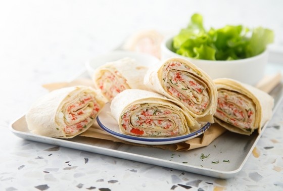 Аккуратно сверните лаваш в рулет и разрежьте его на кусочки шириной около 3–4 см. Выложите рулетики на блюдо и украсьте зеленью.