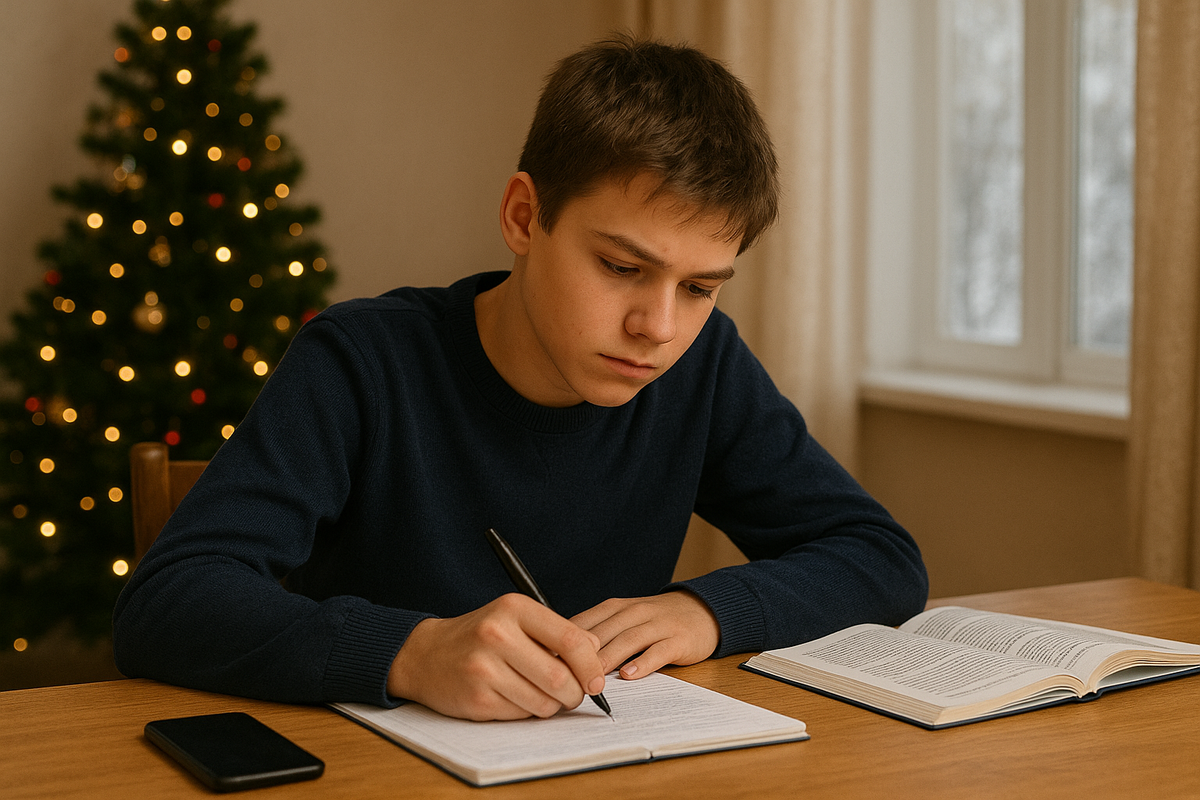 Артём в очередной раз сидел за столом, уткнувшись в пустую тетрадь. За окном падал мягкий снег, а в квартире уже пахло мандаринами и свежей ёлкой, которую они с младшим братом наряжали на прошлой неделе. Но Артёму было не до веселья.