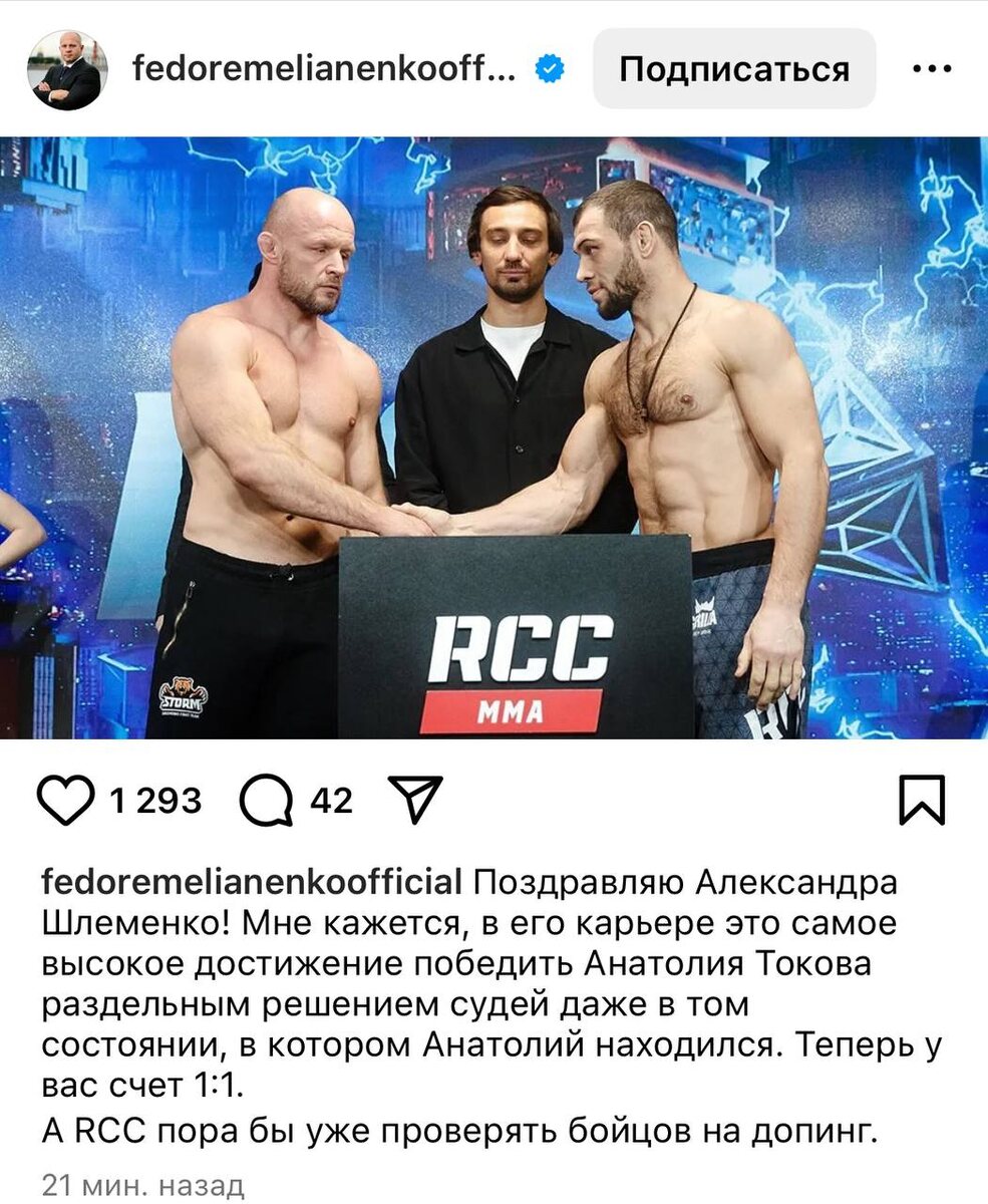 «Федор, привет тебе. Спасибо большое за поздравления. Знаешь, ты действительно прав, что для бессовестного, беспринципного блогера в 40 лет победить твоего ученика, который три месяца готовился к бою со мной, а также прошел отдельный сбор в Дагестане, это достаточно большое достижение. Но я только не понял твоего прикола про допинг-контроль. Ты бы хотел, чтобы у нас был допинг-контроль и твоего ученика Анатолия Токова не допустили бы к бою? И не было бы боя? И не было бы моей победы над ним? Тогда мне повезло, что в RCC не было допинг-контроля»