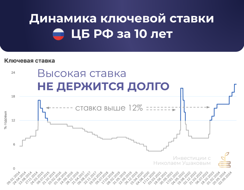 Теперь мы с вами знаем, что весь 2024 год стоимость акций снижалась. А всё потому, что ключевая ставка росла. И находится она сейчас очень и очень высоко… Может, конечно, и ещё подрасти… Кто ж её знает… Но благодаря этой самой ставке мы получили и положительные, и негативные эмоции. 👍 Положительные — это, конечно же, крайне приятные цены на акции. Прям распродажа в самом разгаре. От краткосрочных инвесторов и спекулянтов акции перетекают к долгосрочным инвесторам — а это как раз мы с вами. А ещё, покупая по таким сладким ценам, мы на долгие годы фиксируем высокую (очень и очень высокую) дивидендную доходность — можно сказать, дивидендную зарплату. И с каждым годом она будет только расти. 😔А негатив, конечно, тоже имеется — сложно зачастую видеть красные цифры в портфеле (да и весь портфель тоже может быть красным). Радует то, что это крайне ❗️временное явление. За прошлые 10 лет ключевая ставка в РФ была высокой в сумме всего 2 года👇 👆А по мере снижения ключевой ставки, акции расту
