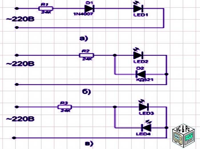 Некоторые варианты схем подключения светодиода к сети 220 В изображены на рисунке.