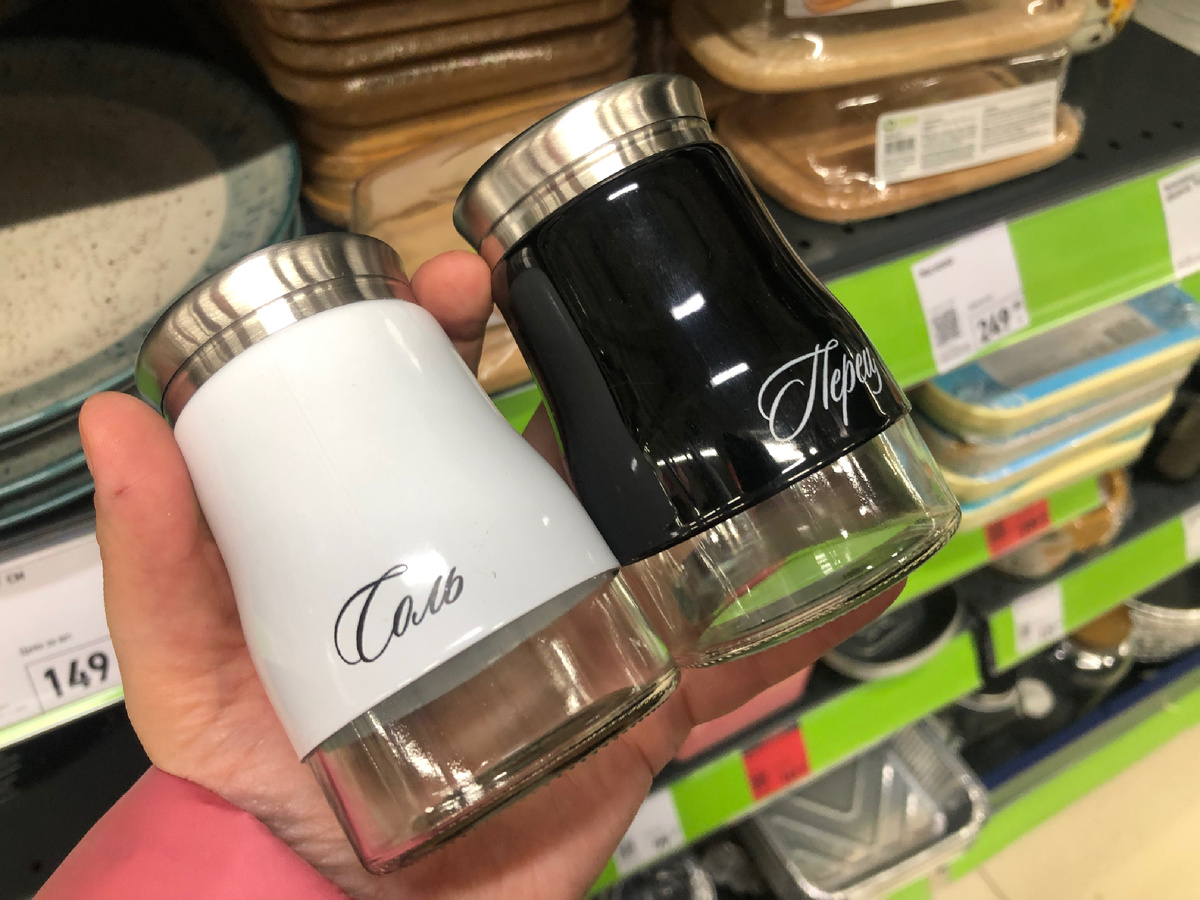 На полочках увидела емкости для специй. Их периодически привозят. Емкости стеклянные с надписями в ассортименте «соль», «перец», «специи». Также они отличаются по цвету. Материал: стекло, нержавеющая сталь. Объем 140 мл. Стоимость 69 рублей.