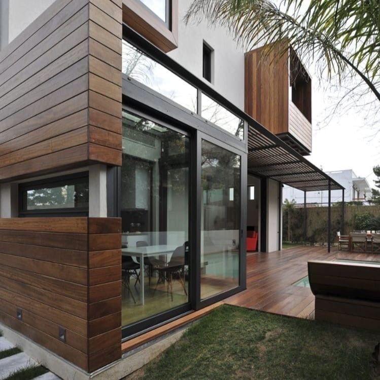 Обустройство придомовой территории, фасада дома, крыльца, террас или беседок – вопрос щепетильный. Качество, выбранных материалов должно быть на высоте, чтобы все не пришлось переделывать через один, два года, и выглядеть все это должно так, чтобы соседи позавидовали. Внешняя отделка всегда страдает от погодных условий, поэтому мы предлагаем использовать материал, который их не боится. Это термодревесина. Инновационный материал, чьи характеристики выдержат даже самые экстремальные условия: Рассмотрим, как можно использовать ее для обустройства придомовой территории. Начнем с фасада. Для его оформления используется специальная фасадная доска, она проста в монтаже и благоприятно влияет на вентиляцию, тепло- и шумо- изоляцию. Далее спускаемся на крыльцо, отделанное террасной доской. На таком крыльце хочется поставить уютное кресло-качалку и отдыхать теплыми летними вечерами. Как правило, крыльцо делают открытым, что дает погодным катаклизмам влиять на качество материалов. Спускаясь с крыл