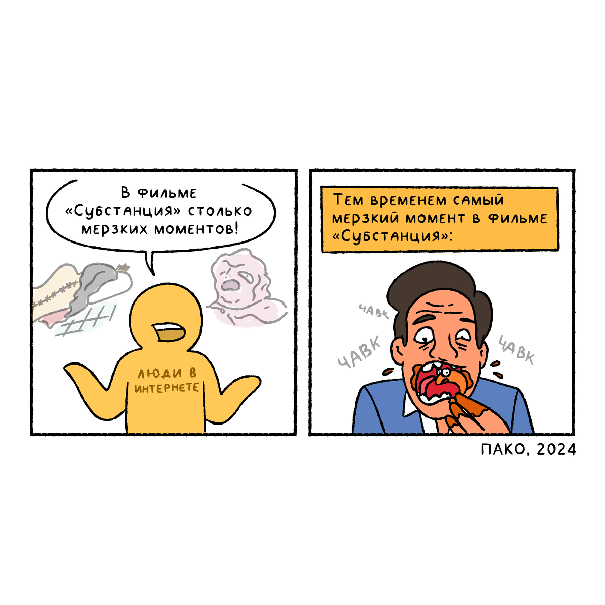 Всем привет, меня зовут Павел Пако и с 2016 года я рисую комиксы. Сейчас у меня есть две основных серии - «Мозги трески» и «Почти 100 привидений» - новые выпуски которых выходят еженедельно. Ну а еще иногда в моей группе в VK (а также в Телеграм-канале) также появляются и небольшие скетчевые комиксы обо мне и моих увлечениях - будь то кино, сериалы, видеоигры или что-то еще. Условно эту серию можно назвать «Жизненные зарисовки» и здесь я стараюсь делиться ее выпусками (а заодно и немножко о них рассказывать), когда накапливается нужное количество комиксов для целой подборки. И вот такой момент снова настал! После премьеры фильма «Субстанция» о нем очень много говорили в сети: к примеру, мне часто попадались ролики о том, что некоторые зрители не могли досидеть до конца сеанса - настолько неприятным для них был фильм. Мне, как давнему фанату жанра ужасов, «Субстанция» жуткой совсем не показалась, о чем я и решил пошутить в своем небольшом комиксе. Первый сезон мультсериала «Аркейн» мне