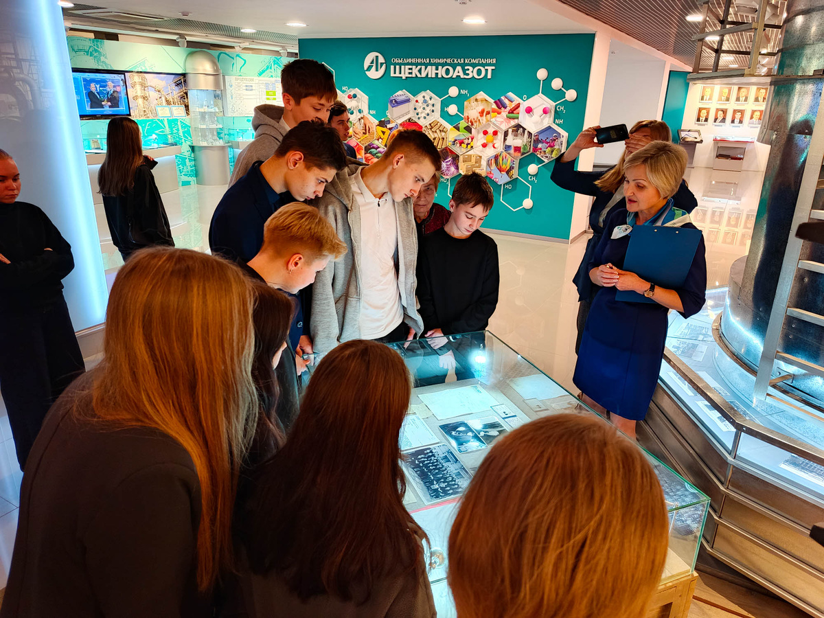 В Зале трудовой славы заместитель начальника отдела труда и заработной платы АО «Щекиноазот» Ангелина Матюшкина рассказала школьникам об историческом прошлом предприятия, масштабных проектах нового времени, почетных работниках и руководителях, новейших производственных установках и выпускаемой продукции.