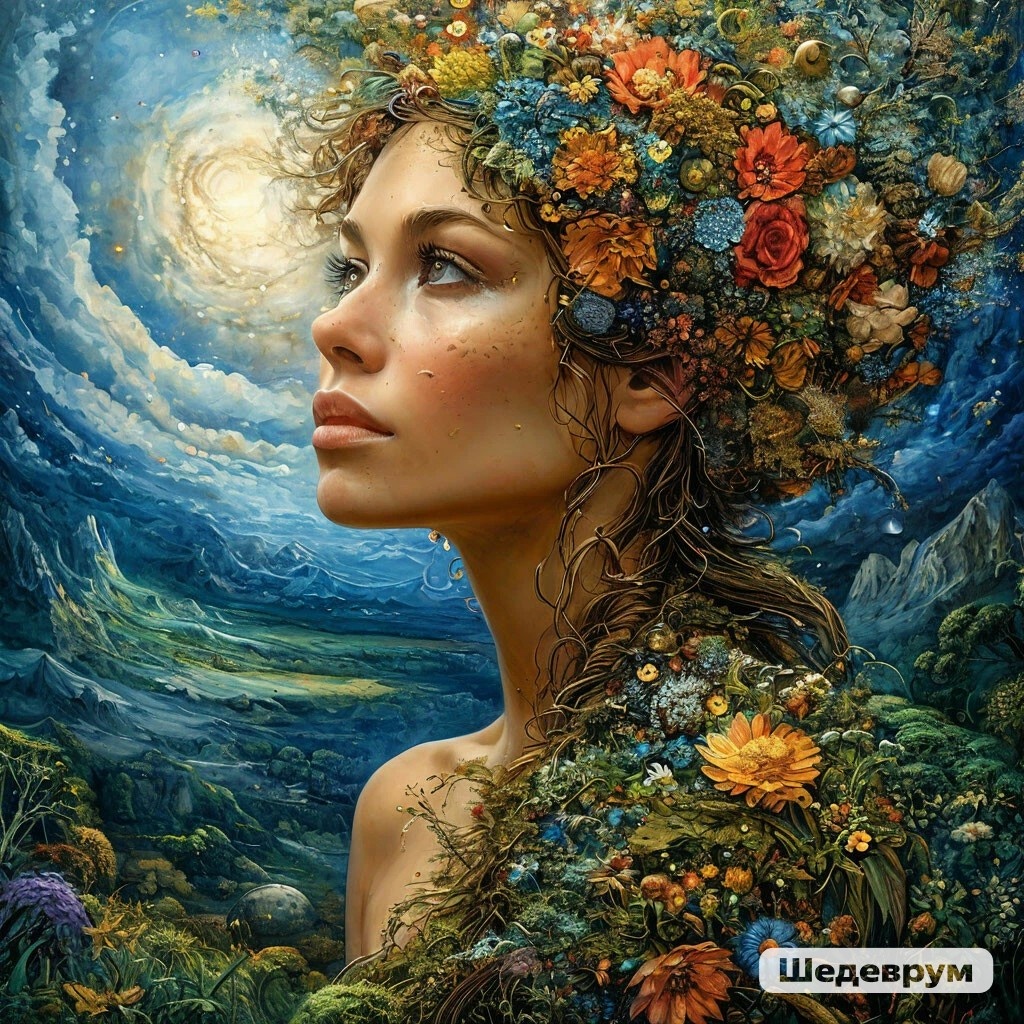 Гея, богиня Земли, пребывала в глубокой задумчивости, она взирала вдаль, где бескрайний горизонт терялся в бесконечности частиц хаоса. Её глаза, полные мудрости и заботы, отражали всю глубину её чувств. Мир, созданный ею, был великолепен, но в нём отсутствовало что-то важное, что наполняет душу теплом и радостью. Гея ощущала пустоту, которая жила в её сердце, несмотря на всю её мощь и силу.