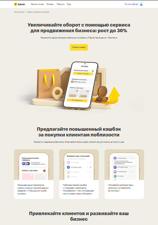 Увеличивайте оборот с помощью сервиса для продвижения бизнеса: рост до 30% Расскажите о вашем бизнесе в мобильном приложении Т‑Банка. Размещение — бесплатно
