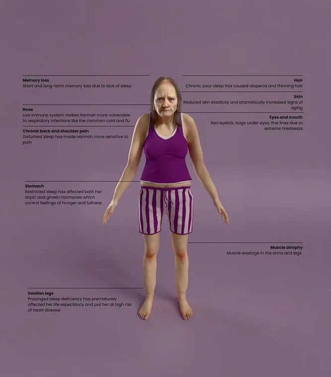 Эксперт по сну показала, как зумеры будут выглядеть через 25 лет, если будут мало спать В визуализации изобразили женщину, которая спала примерно по 6 часов в сутки. К 2050 году постоянный дефицит сна может привести к множеству хронических проблем со здоровьем. Специалисты создали гротескное изображение 45-летней женщины по имени Ханна, которая живет в 2050 году. Эксперты учли все возможные недуги, от которых человек может страдать из-за постоянного недосыпа. Образ Ханны был создан на основе 19 исследований, связанных с дефицитом сна. С молодого возраста Ханна спала всего по 6 часов в сутки, что в ее случае привело к хроническим болям в спине и отекам ног. Кроме того, у нее редкие волосы, дряблая кожа и большие мешки под глазами. Она также страдает от атрофии мышц и часто болеет гриппом из-за слабого иммунитета. Источник: https://www.pravilamag.ru/news/society-news/14-12-2024/738105-ekspert-po-snu-pokazala-kak-zumery-budut-vyglyadet-cherez-25-let-esli-budut-malo-spat/