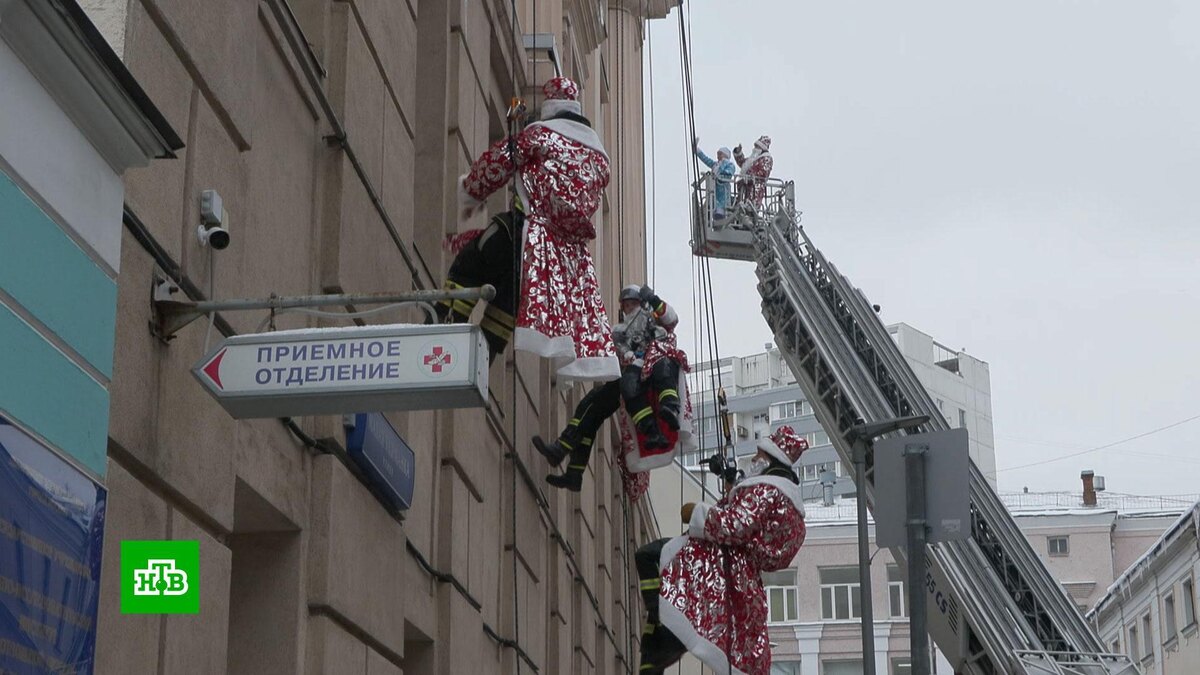 Деды Морозы в Москве спустились с крыши и поздравили маленьких пациентов