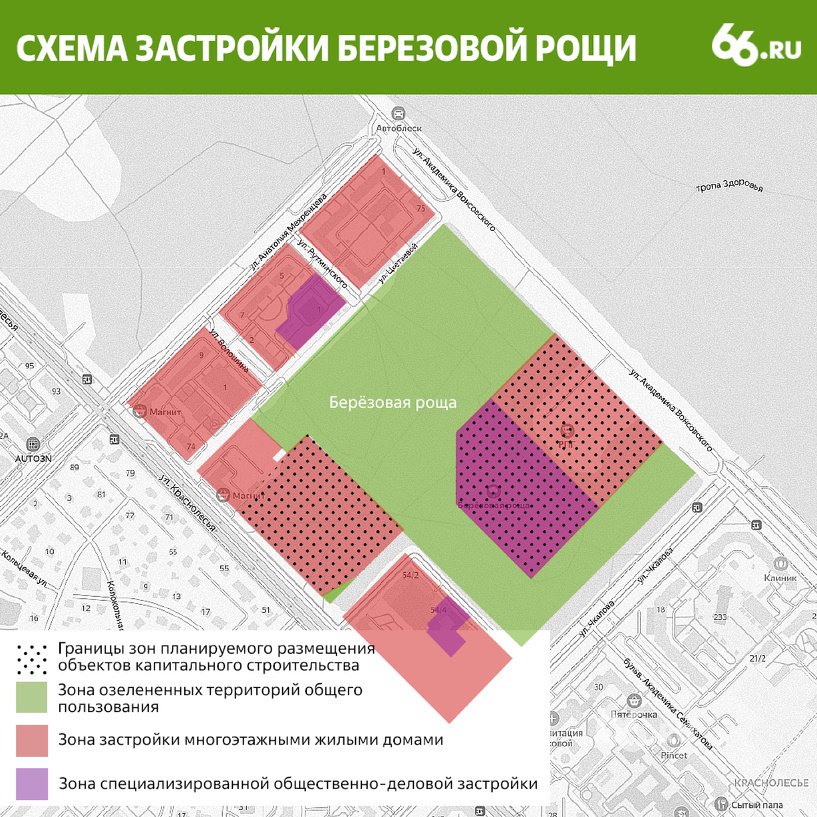 Землю под застройку компания «Атомстройкомплекс» приобрела в 2018 году у федеральной структуры «Дом.РФ». Новый квартал займет 40% территории Березовой рощи. В том месте запроектировано:
