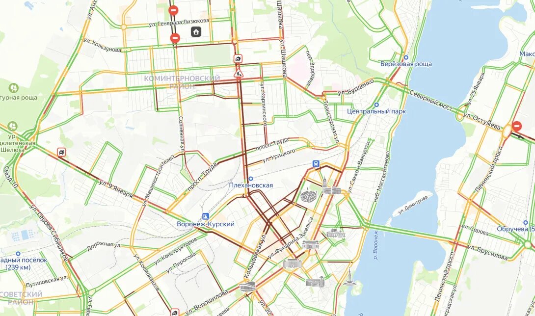 В самом центре ситуация не лучше. Крайне медленно автомобильный поток движется по улице Революции 1905 года и Кольцовской, есть пробка на Никитинской и проспекте Революции. В районе Цирка сложно будет проехать как по 20-летия Октября, так и по Кирова.