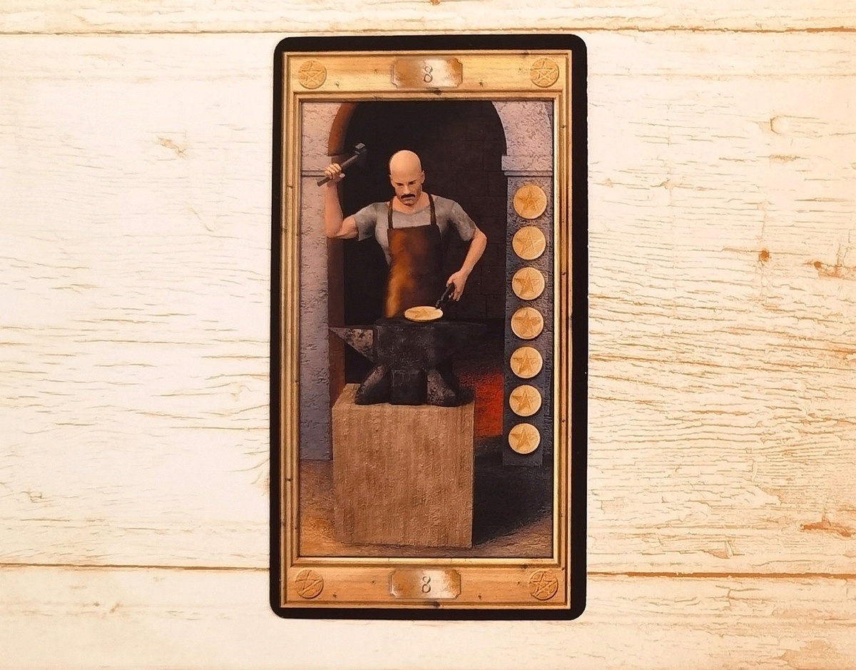 Для расклада на вторник беру колоду "Таро Универсальный ключ", так как в этот день в 1926 году была проведена первая Всесоюзная перепись населения. Вытаскиваю младший аркан — "8 Пентаклей". Аркан "Восьмерка Пентаклей". "Таро Универсальный ключ". Восьмерка Пентаклей неактивно приходила на расклад и в большинстве своем показывала изготовление деревянных пентаклей (ссылка на подборку - в конце статьи). На выпавшем аркане мы видим кузнеца, который в своей кузнице выковывает на наковальне восьмой по счету пентакль из золотистого металла. Еще семь готовых пентаклей висят на одной из сторон полукруглой арки, расположенной за спиной нашего трудолюбивого героя. Одет он в серую рубаху с короткими рукавами, открывающую его сильные и мускулистые руки, которыми держит клещи и молоток. Его туловище почти полностью закрывает коричневый кожаный фартук для защиты от частиц раскаленного металла. Голова его налысо обрита, вероятно, чтобы не было жарко от волос. Но небольшие черные усики намекают, что он