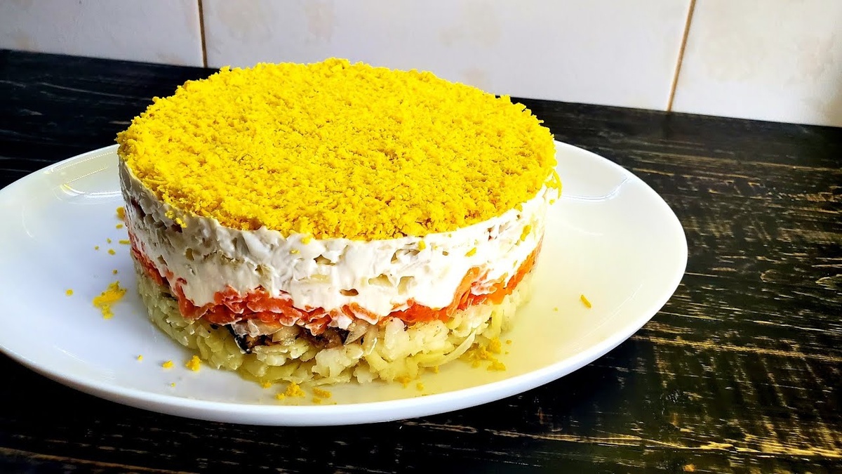 1. Консервированная рыба (например, сайра или тунец) — 1 банка 2. Яйца — 4 штуки 3. Картофель — 3-4 штуки 4. Морковь — 2 штуки 5. Репчатый лук — 1 штука 6. Майонез — по вкусу 7. Соль — по вкусу 8. Зелень (для украшения) — по желанию 1. Отварите овощи и яйца: Картофель и морковь отварите в мундире до готовности. Охладите и очистите. Яйца отварите вкрутую, охладите и очистите. 2. Подготовка рыбы: Откройте банку с рыбой и слейте жидкость. Разомните рыбу вилкой. 3. Подготовка лука: Мелко нарежьте репчатый лук и замочите его в холодной воде на 10-15 минут, чтобы убрать лишнюю горечь. Затем слейте воду и обсушите лук. 4. Натирайте овощи и яйца: Натрите картофель на крупной терке. Натрите морковь на мелкой терке. Натрите белки и желтки отдельно на мелкой терке. 5. Соберите салат слоями: Выложите слои в следующем порядке, смазывая каждый слой майонезом: Рыба Лук Картофель Морковь Желтки Белки 6. Охлаждение: Накройте салат пищевой пленкой и поставьте в холодильник минимум на 2 часа,