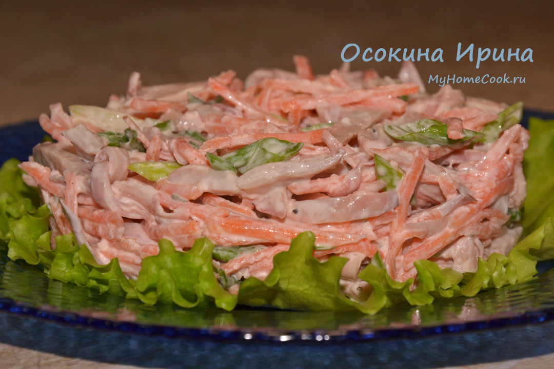 Салатик простейший по ингредиентам, но и необычный одновременно. Сырая морковка придаёт ему интересную текстуру и сочность. Потёрла на корейской тёрке 1 крупную морковь, заправила 2 ст.л. сметаны, добавила измельчённый зубчик чеснока, присолила и промешала, затем добавила 3 кальмара соломкой и горсть резаного зелёного лука, снова промешала, немного настояла и подала. Простой, но ооочень вкусный салатик) Приятного аппетита