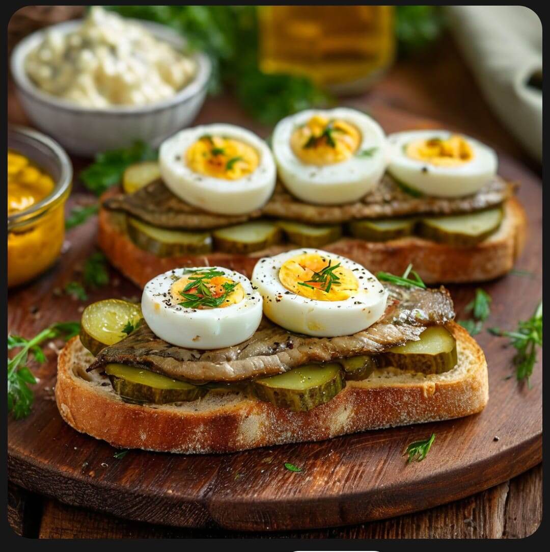 Бутерброды со шпротами, яйцами и солёным огурцом