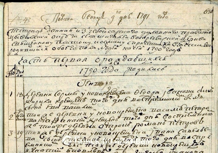 Государственный исторический архив Чувашской Республики. Фонд № 225, Опись № 3, дело № 59. Стр. 714-716 скан. Тетрадь данная из Чебоксарского Духовного правления Цывилской округи село Шигалей Воскресенской церкви священнику Платону Космину с причетники в части ево их родившихся обоего пола на сей 1790 год. Часть первая. О родившихся. 1790 года родились. Генваря 1. 18 числа. Деревни Сормы у новокрещена Фёдора Иванова сын Кирила крещен того же дня восприемником был сын ево Василий. 2. 18 числа. Деревни Сормы у новокрещена Василия Петрова сын Афанасий крещен того же дня восприемником был той ж деревни отрок Роман Петров. 3. 19 числа. Деревни Сормы у новокрещена Ивана Савельева сын Степан крещен того же дня восприемником был той же деревни новокрещен Игнатий Яковлев. 4. 24 числа. Деревни Сормы у новокрещена Григорья Иванова дочь Ксения крещена того же дня восприемницей была той же деревни новокрещена Анна Осиповна. Февраля 5. 5 числа. Деревни Яшкильдины у крещена Ивана Михайлова дочь Агафи