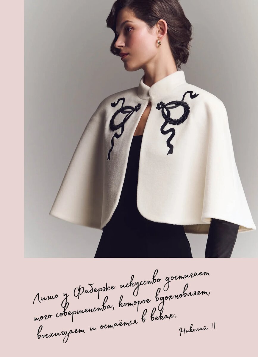 Я влюблена в кейп с вышивкой, напоминающей то ли банты, то ли яйца Фаберже. Лично мне видится все тоже легендарное яйцо Ландыши, о котором мы ранее говорили, но в новом прочтении, резко отличающемся от предыдущего бренда.