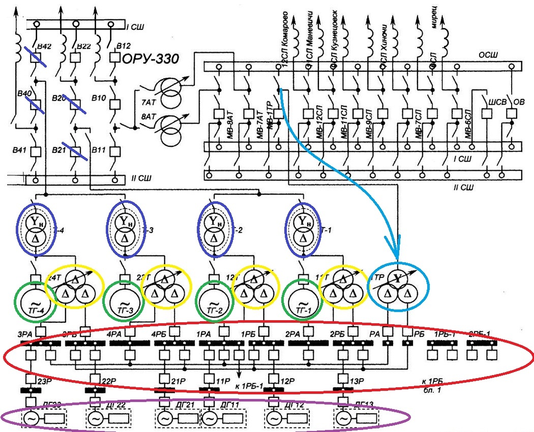 При нормальной работе энергоблоков электроэнергию вырабатывают 4 турбогенератора (обведены зелёным), а на ОРУ 330 кВ она выдаётся через 4 генераторных трансформатора (синее). Между турбогенераторами и трансформаторами подключены трансформаторы собственных нужд (ТСН, жёлтое), которые и запитывают систему СН энергоблоков (красное). Как видим, собственные нужды хорошо зарезервированы, т.е. любую часть энергоблока можно запитать с любого ТСН, соответственно, даже если будет работать только один турбогенератор – будет работать вся система СН.