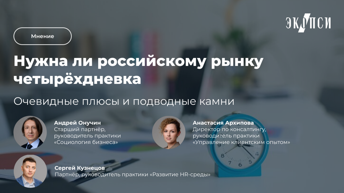 «Если можно выстроить работу, отталкиваясь от целей, а не процессов, переход на четырёхдневную рабочую неделю может быть вполне реальным. Руководитель устанавливает цели сотрудникам, и, если их можно выполнить за меньшее количество дней при условии сохранения качества, — это может быть выигрышно и для компаний. Конечно, не для всех: у производств, как правило, очень специфичная система графиков, это отдельная тема. Но если говорить об офисной работе: консалтинг, аудит, маркетинг, реклама — почему бы и нет?», — размышляет старший партнёр и руководитель практики «Социология бизнеса» Андрей Онучин.