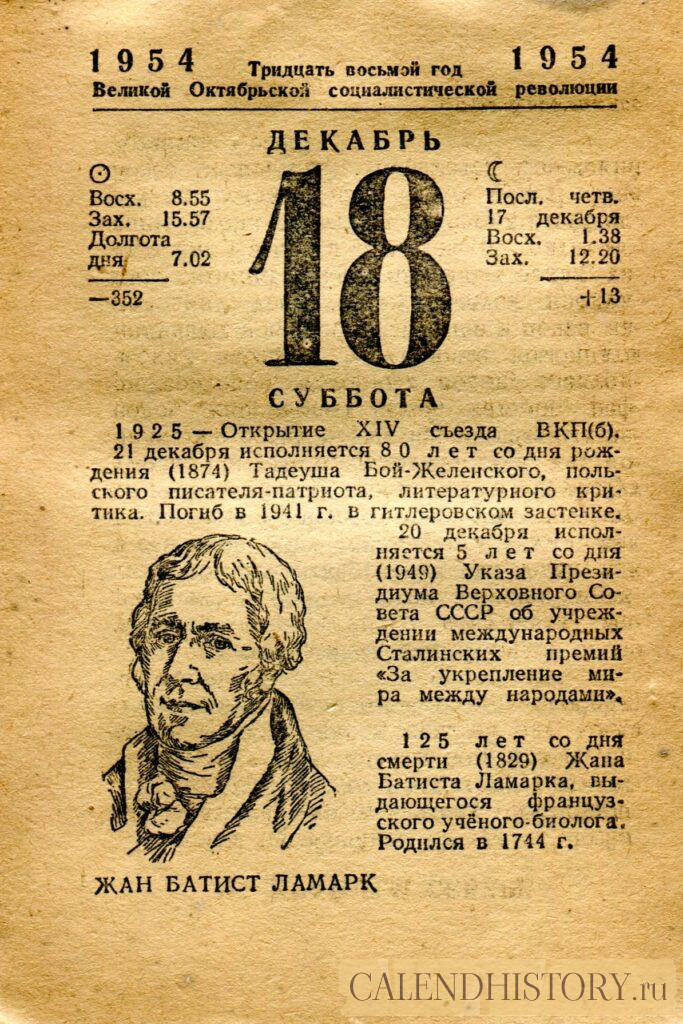 Итак, сегодня 18-го декабря и у нас на календаре 1954-й год. Перед нами листок советского календаря Политиздата. На календаре у нас суббота - 18 декабря 1954-го года. ЖАН БАТИСТ ЛАМАРК 1925 — Открытие XIV съезда ВКП(б). 21 декабря исполняется 80 лет со дня рождения (1874) Тадеуша Бой-Желенского, польского писателя-патриота, литературного критика. Погиб в 1941 г. в гитлеровском застенке. 20 декабря исполняется 5 лет со дня (1949) Указа Президиума Верховного Совета СССР об учреждении международных Сталинских премий «За укрепление мира между народами», 125 лет со дня смерти (1829) Жана Батиста Ламарка, выдающегося французского учёного-биолога. Родился в 1744 г. *** Оборотную сторону листка этого календаря можно посмотреть у нас по ссылке на сайте. Другие листки советских календарей смотрите у нас на сайте - CALENDHISTORY.ru ПОСМОТРИТЕ ЕЩЁ ЛИСТКИ ОТРЫВНЫХ КАЛЕНДАРЕЙ: