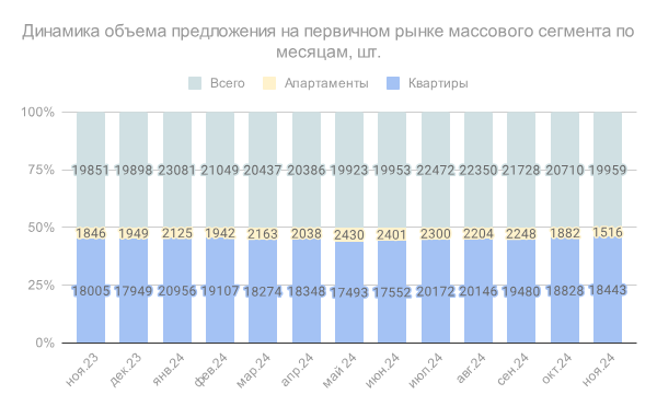 Столичный рынок жилья комфорт- и экономкласса подошел к первому зимнему месяцу с относительно позитивными показателями. Количество заключенных ДДУ выросло на 13,3% по сравнению с октябрем, а средневзвешенная цена 1 кв. м прибавила за месяц всего 0,3% и составила 332 тыс. рублей. Повышение покупательской активности эксперты связывают в том числе с окончанием года, возникновением отложенного спроса на семейную ипотеку, а также с появлением скидок от застройщиков. ⚡️ Новострой-М: подписывайся, в нашем телеграм-канале есть всё о новостройках Москвы и области По данным «Метриум», в ноябре 2024 года на рынке новостроек массового сегмена экспонировалось 20 тыс. лотов (-3,6% за месяц, -10,7% за квартал, +0,5% за год) в 98 проектах, где 18,4 тыс. – квартиры (-2% за месяц, +2,4% за год) и 1,5 тыс. – апартаменты (-19,4% за месяц, -17,9% за год). В ноябре 2024 года на рынке массовых новостроек не стартовал ни один проект массового сегмента. Источник: Метриум По подсчетам аналитиков «Метриум», сред