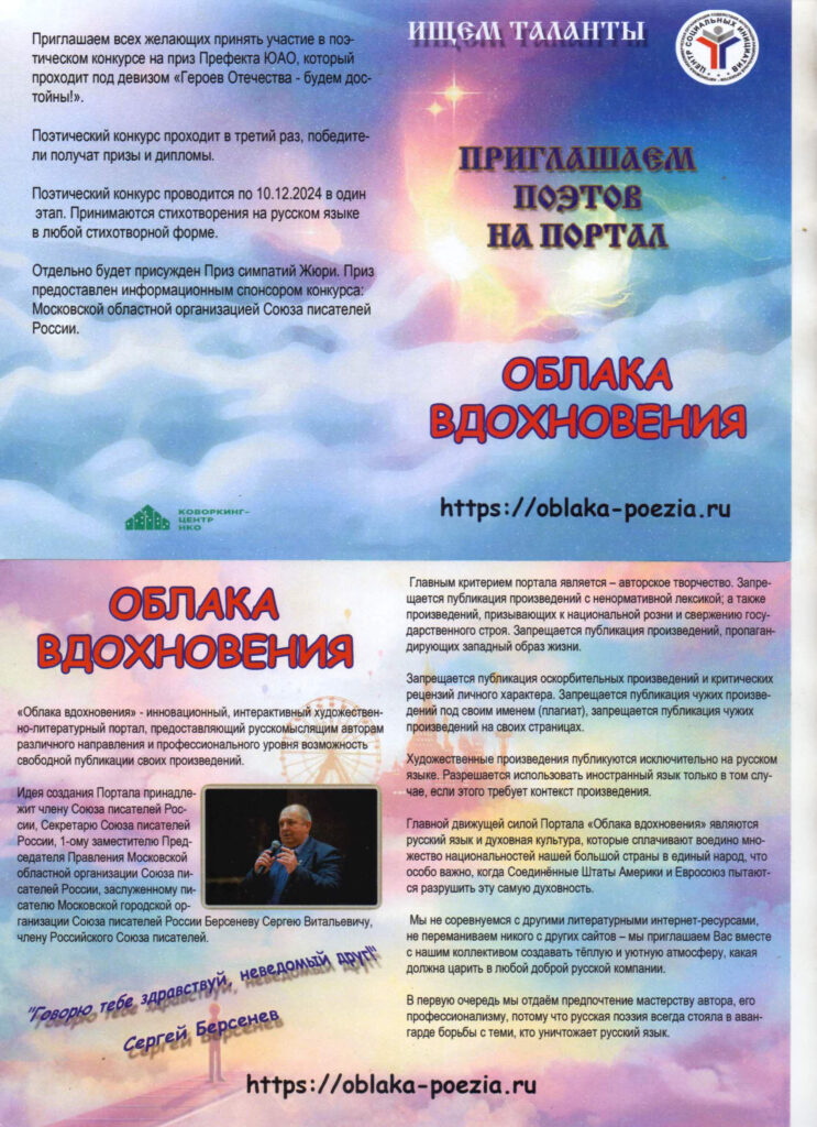 Академик ИАСК Берсенев Сергей Витальевич, поэт, член Союза писателей России, Российского Союза Писателей, Содружества Творческих Сил, Экспертного Совета ВСД «Русский Лад», секретарь Союза писателей России, 1-й заместитель Председателя правления Московской областной организации СПР является организатором Творческого центра «Облака вдохновения» г. Москва и уже много лет руководит этим центром. По праву Сергея Витальевича можно назвать ревнителем русской литературы. По инициативе Берсенева С.В. создан новый художественно-литературный портал «Облака вдохновения», где могут свободно публиковаться авторы поэтических произведений. https://oblaka-poezia.ru