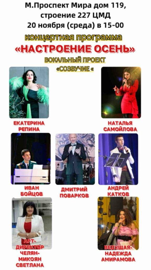 Вокальный проект «Созвучие» с концертом «Осеннее настроение» продолжает дарить людям радостное праздничное настроение. 20.11.24 этот концерт прозвучал для участников ЦМД на проспекте Мира. Среди участников концерта академики ИАСК: Екатерина Репина, Наталья Самойлова, Дмитрий Поварков, Андрей Катков И, конечно же Светлана Челян Микоян – организатор этого концерта, арт-директор проекта.