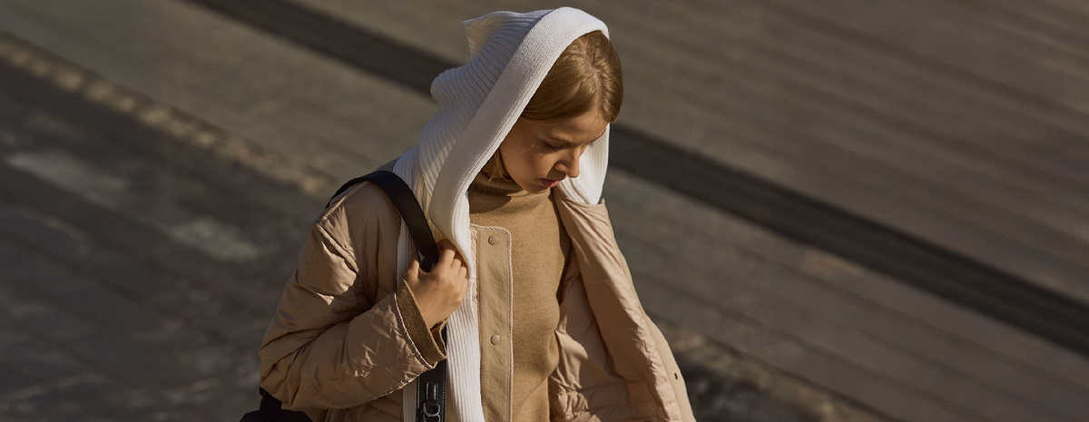 Легкий и свободный, этот капор заменяет собой целых два аксессуара – шапку и шарф. Больше не нужно мучиться, подбирая подходящие по цвету и стилю элементы. Капор обеспечивает простор для вашей модной фантазии: вы можете туго затянуть его с помощью завязок, чтобы дополнить аутфит в стиле спорт-шик, а можете оставить свободным, создавая классический женственный образ.