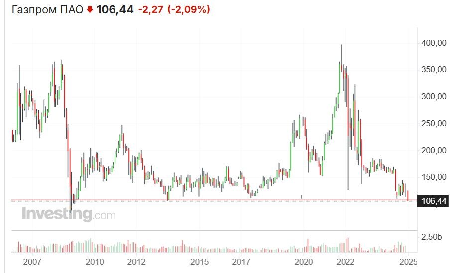 Сегодня акции Газпрома падали до 106,1 руб. Дешевле Газпром был только в самый разгар мирового финансового кризиса в 2008 году (меньше 100 руб.). Но недолго - 2-3 месяца. Теперь же компания пришла в район 100 рублей, похоже, надолго. И, возможно, скоро мы увидим двузначные цифры. И даже льготы в бюджете 2025-26 не могут спасти Газпром. Очередная потеря рынков Европы (отказ Украины и ЕС от транзита газа компании с 2025 года) - последняя новость, подкосившая компанию. У провала «Газпрома» есть фамилия. Эта фамилия – Путин.